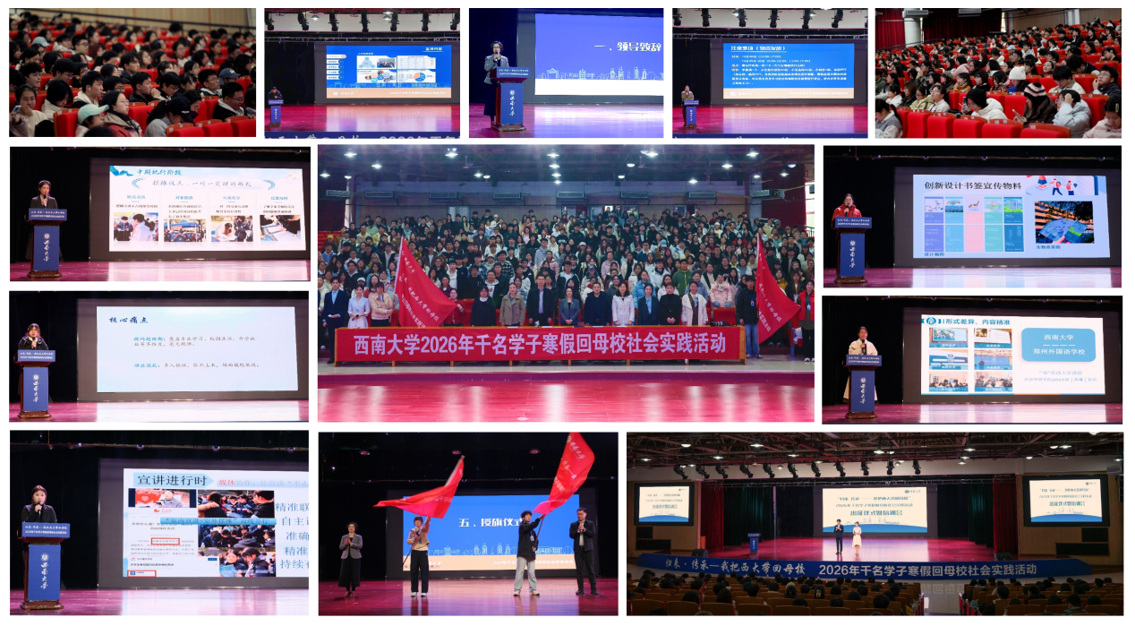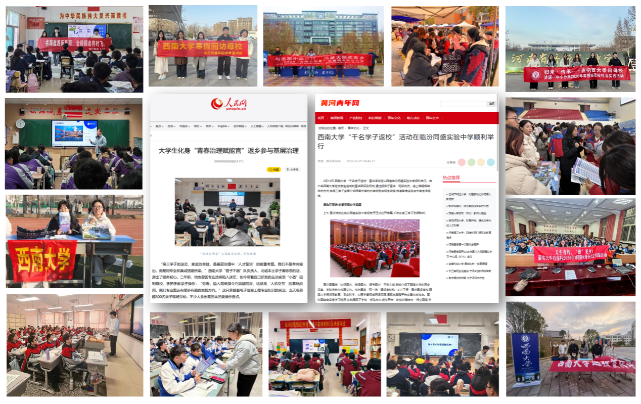 2026年“归来·传承——我把西大带回母校”千名学子寒假回母校社会实践活动圆满收官。本次活动以感谢母校师恩、助力高考学子、讲述西大故事为核心,累计吸引超5000名学子、1300余支队伍报名参与;经严格审核筛选,最终选拔3300余名学子组成692支实践队伍,奔赴全国30个省(自治区、直辖市)的重点生源中学,开展招生宣讲与咨询活动。活动不仅搭建起高校与中学的沟通桥梁,更让学子在实践中锤炼能力,取得了良好的育人与宣传成效。